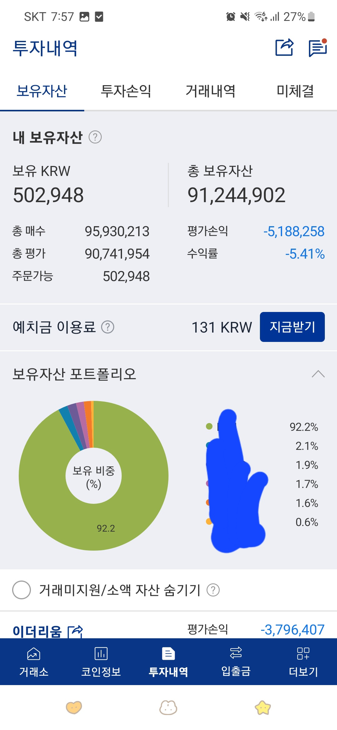 다행이 지금은 다시 조금 반등해줬지만 여전히 수익률은 -500만원 왔다갔다 하고 있습니다.